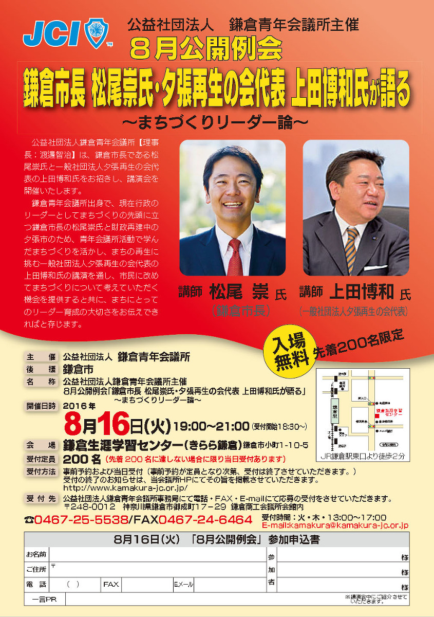 8月公開例会 鎌倉市長松尾崇氏・夕張再生の会代表上田博和氏が語る 〜 まちづくりリーダー論! 〜 開催のご案内 〜 2016年7月16日に掲載しました