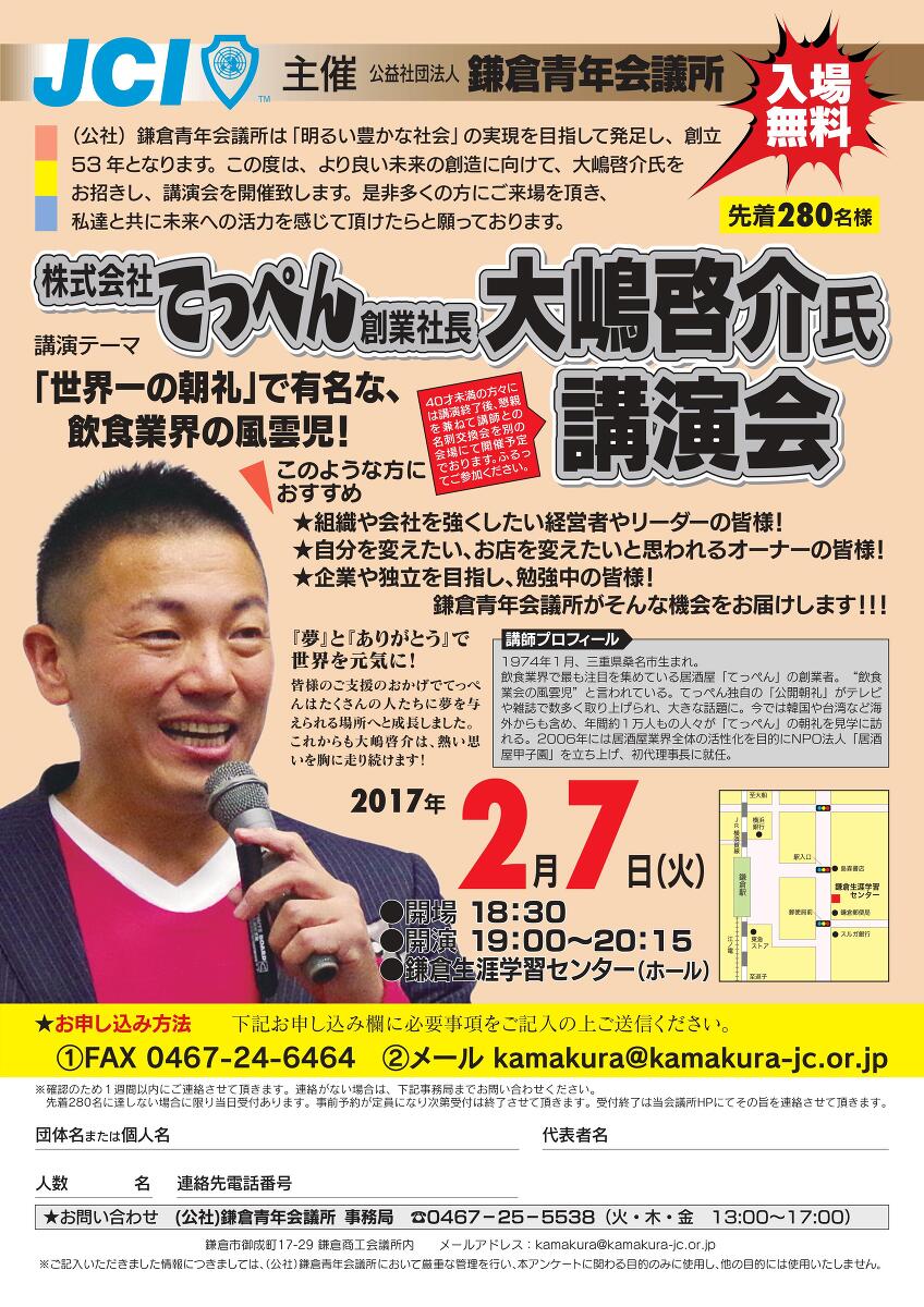 (公社)鎌倉青年会議所は「明るい豊かな社会」の実現を目指し発足し、設立53年となります。この度は、より良い未来の創造に向けて、大嶋啓介氏をお招きし、講演会を開催致します。是非多くの方にご来場を頂き、私達と共に未来への活力を感じて頂けたらと願っております。