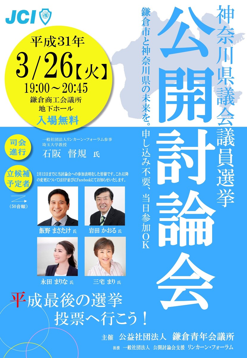 2019年4月7日の統一地方選挙に先立ちまして、神奈川県議会議員選挙における公開討論会を開催いたします。