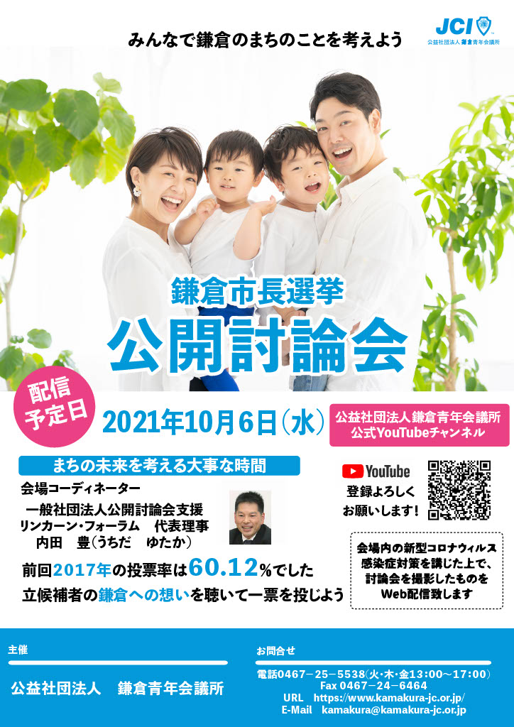 10月6日水曜日19時より、公益社団法人鎌倉青年会議所の公式YOUTUBE( 公益社団法人鎌倉青年会議所 - YouTube)にて10月10日告示、10月17日投票日をむかえる鎌倉市長選挙の立候補予定者にによる公開討論会の様子を動画にアップします。