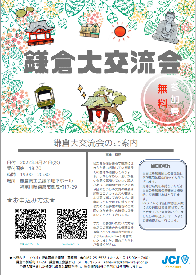 私たちが住み暮らす鎌倉にはまちを想い活動している数多くの団体が活動しております。しかしながら、互いが互いを深く認知していない現状があり、組織間を超えた交流や団体どうしの交流の機会は新型コロナウィルスの蔓延により更に減っております。鎌倉のまちを今以上に盛り上げるために、8月24日に鎌倉大交流会の開催をいたします。