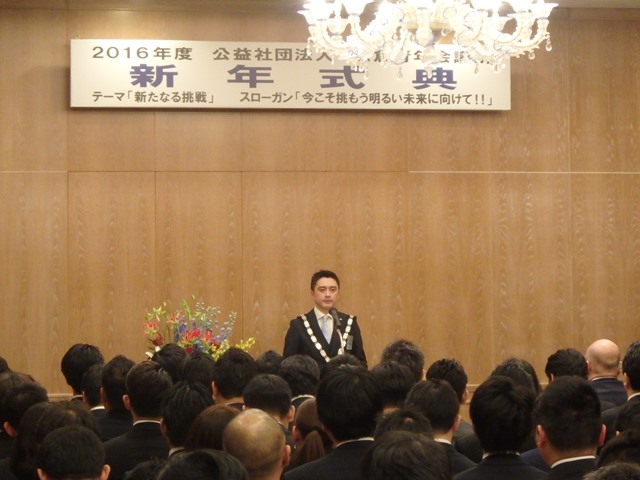 新年式典では第52代理事長 渡邉智治君より所信表明をさせていただき、テーマ「新たなる挑戦」、スローガン「今こそ挑もう明るい未来に向けて!!」のもと、2016年度の事業がスタートいたしました。