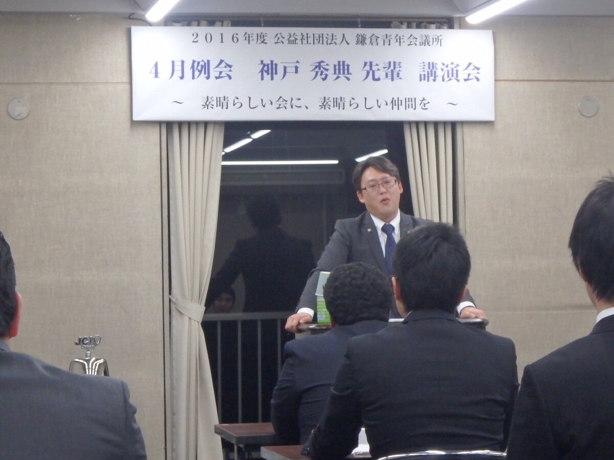 4月5日に4月例会「神戸秀典先輩講演会〜素晴らしき会に、素晴らしき仲間を〜」と題してご講演が鎌倉商工会議所にて開催されました。