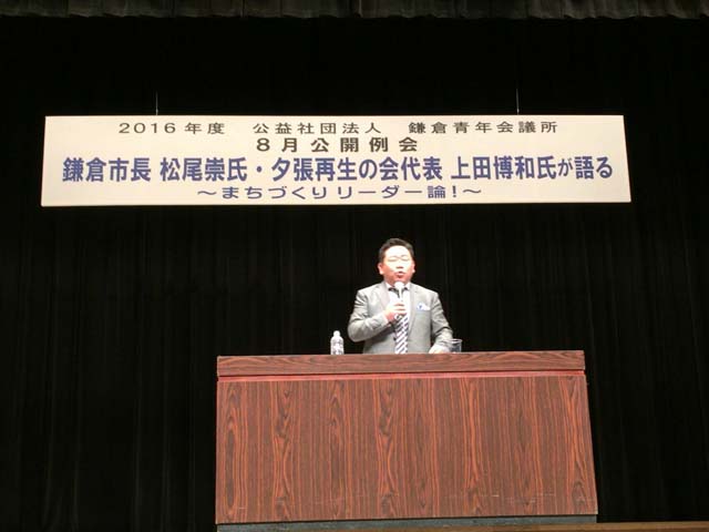 平成28年8月16日(火)、鎌倉市生涯学習センターのホールにて8月公開例会 「鎌倉市長松尾崇氏・夕張再生の会代表上田博和氏が語る〜まちづくりリーダー論〜」を開催いたしました。