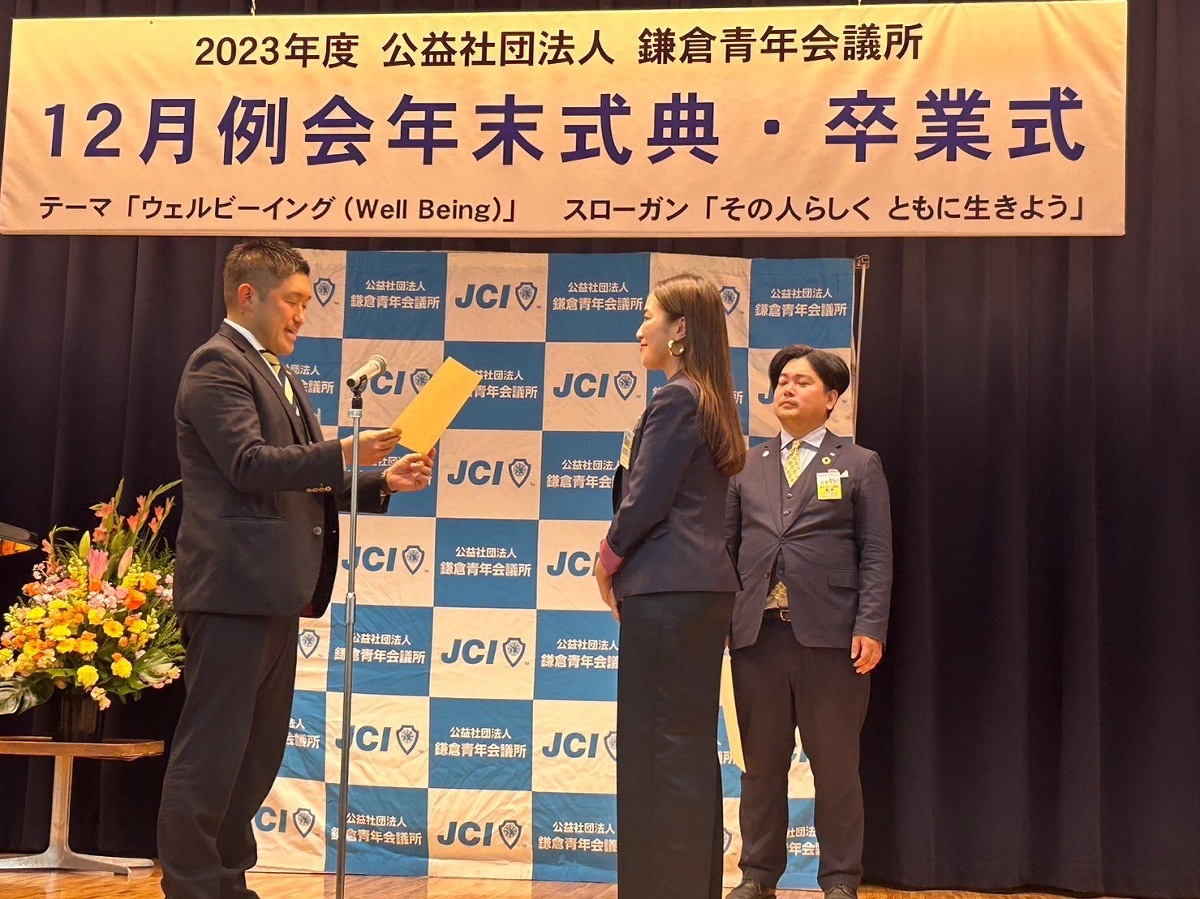 また、12月式典では片根理事長により事業に対する一年間の総括と褒賞、そして来年度理事長の森山次年度理事長へのプレジテンシャルリースの伝達式が行われました。式典内では本年度鎌倉青年会議所を卒業される、内海寿理君、古賀太平洋君、永田磨梨奈君への卒業証書の授与。残る現役メンバーに対する熱い思いを届けていただきました。